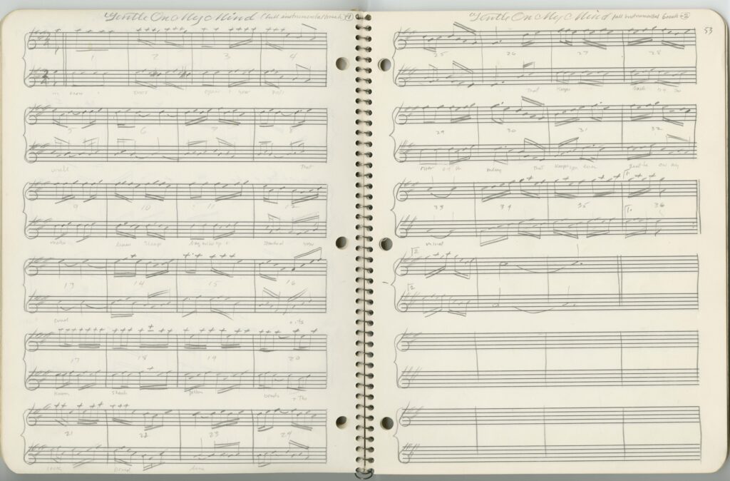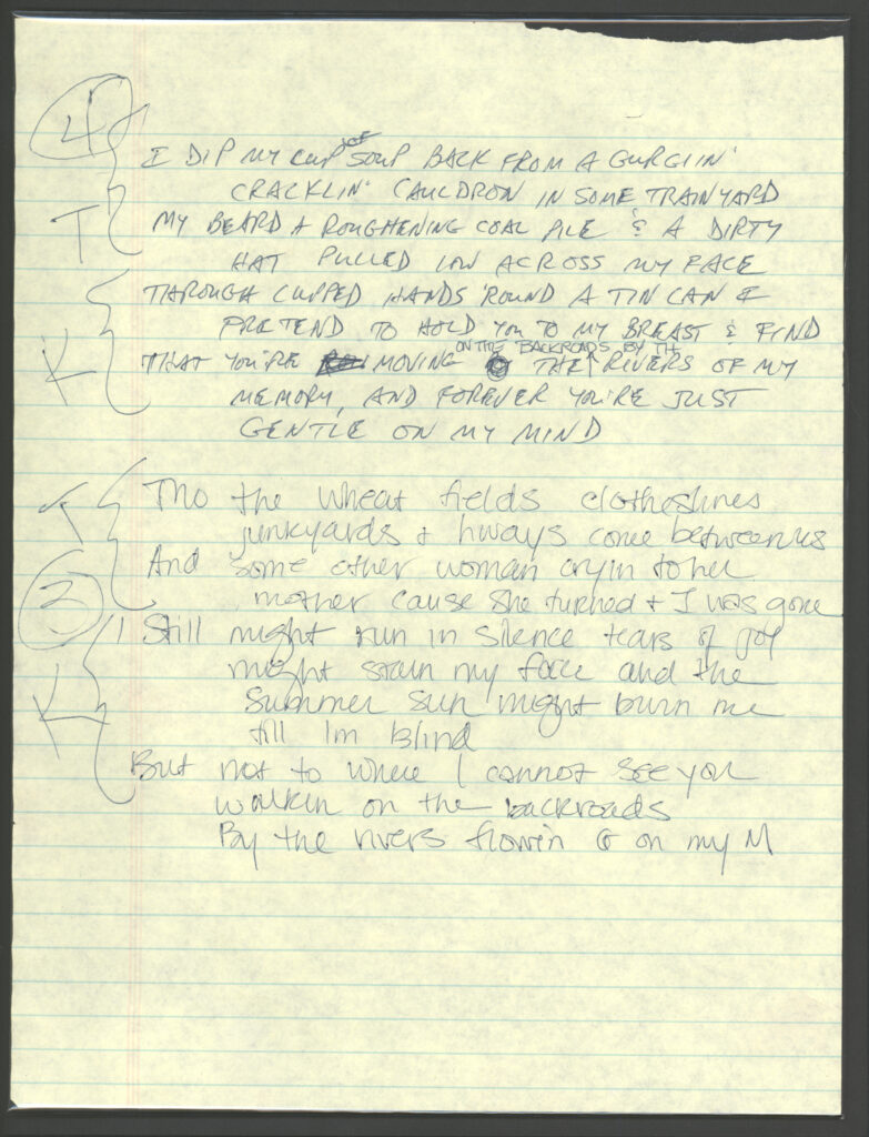 The third image is the fiddle version of the song, found in the sixty-eight personal music journals that John kept in the last two decades of his life. Once you’ve written a song like “Gentle On My Mind,” you’re obligated to perform it at every show you play thereafter for the rest of your days, so you have to keep it fresh. You can compare John’s original version from 1967, and this later version from his performance at David Holt’s American Music Shop in the 80s to see how he did that.